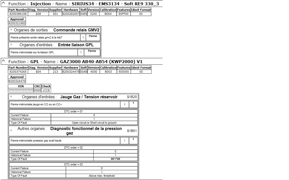 Aujourd'hui impossible de me connecter avec DDT sur le calculateur GPL, le calculateur classique est détecté sans problème. Si je débranche le calculateur GPL j'obtiens le même résultat. Dimanche j'avais aussi eu ce problème mais très rapidement ddt avait trouvé le calculateur. Et si la panne venait du calculateur? Calculateur HS, problème d'alimentation, humidité... j'ai démonté la connectique, la batterie, rien, que dalle... Le calculateur semble fonctionné par intermittence lorsque le moteur est chaud. Le calculateur est un GAZ 3000 de chez Renault. Il faudrait essayer avec un autre calculateur, la panne ne doit pas être courante. Une idée? pops 91 as tu des problèmes pour trouver le calculateur GPL avec DDT?