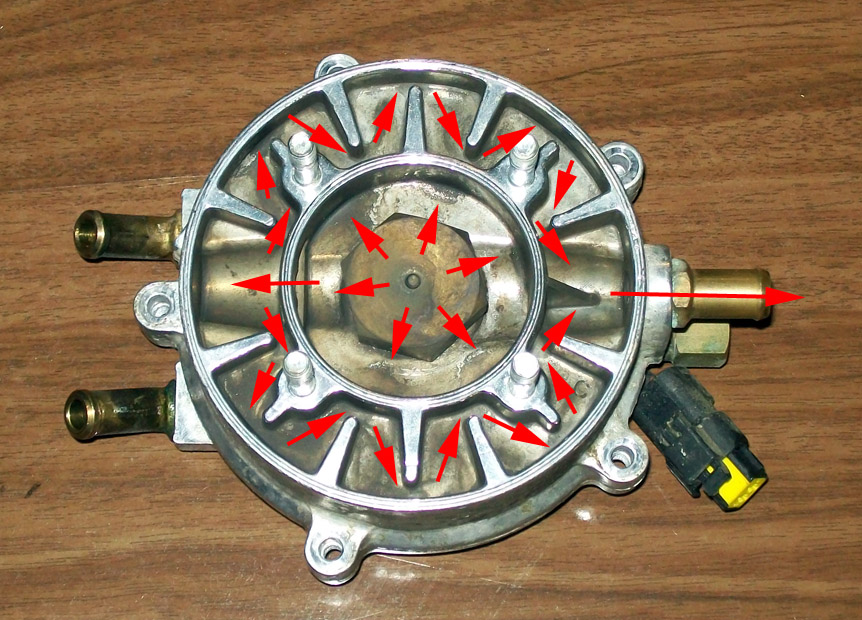 2) Encrassement et dépots. Des dépôts pourraient obstruer les petits trous autour du boiseau, ou gêner les mouvement du boiseau et de son aiguille, ou réduire le passage libre pour le LPG gazeux. Le détendeur visible dans ce tuto était encore très propre malgré la grande quantité de gaz déjà débitée (équivalent à plus de 250.000km avec une voiture de moyenne cylindrée). Il semble que dans certains pays (France par exemple) le LPG vendu contient assez bien de "crasses" et d'impuretés. Vu que le nettoyage est facile et ne demande aucune compétence particulière ni aucun outil spécial, c'est une opération à envisager en cas de dysfonctionnement.