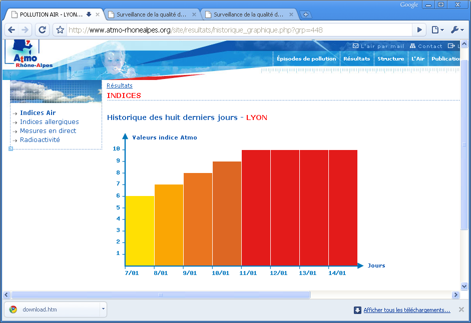 http://www.lepost.fr/article/2009/01/13 ... -lyon.htmlEn fait ce n'est lĂ encore par 8/10, mais 10/10 de pollution, depuis plusieurs jours Ă Lyon.