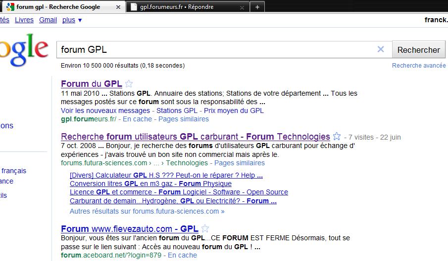 Près d'un an et demi plus tard, vous l'aurez peut-être remarqué depuis le temps, notre forum du GPL est référencé en pôle position de Google (avec des liens secondaires appréciables : "Voir les nouveaux messages - Stations GPL - Prix moyen du GPL") :