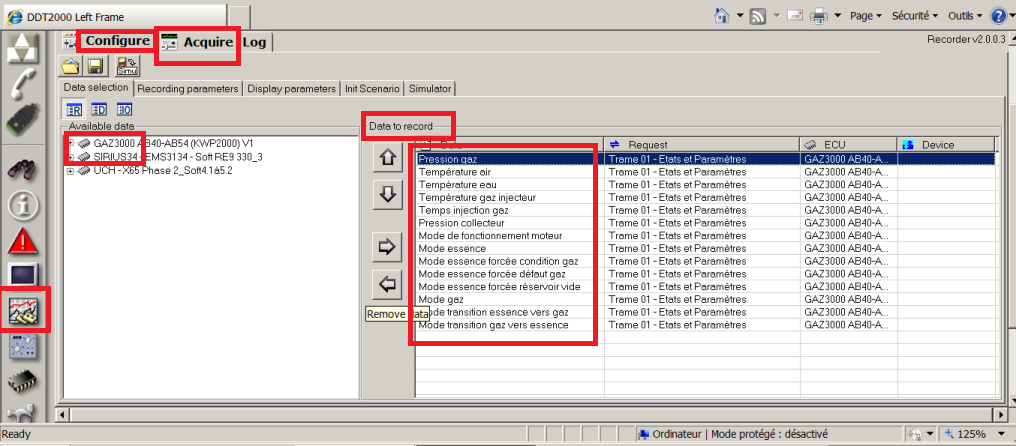 dans available data -> Gaz3000, double cliquez sur les paramètres que vous voulez visualiser et/ou enregistrer; (cf: capture écran avec mes sélections )